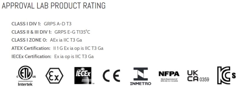 • cETLus, ATEX, IECEx, UKCA, INMETRO ve KOSHA tarafından derecelendirilmiştir.